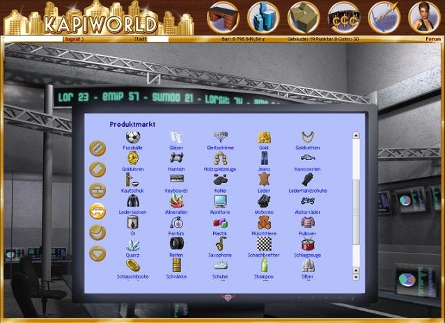 Zusammenfassung KapiWorld ist eine anspruchsvolle Wirtschaftssimulation, die alles an strategischen Fähigkeiten fordert. Du hast die Möglichkeit alleine Ruhm und Macht zu erreichen, kannst aber auch Hand in Hand mit anderen Spielern ein Imperium aufbauen. Die elementaren Teile dieses Spieles sind Handel, Kalkulation, Taktik und Spekulation. Ein aufregendes Browsergame um Bilanzen, Luxus, Macht und Prestige. Gib Deinen Anwohnern wieder eine Perspektive!